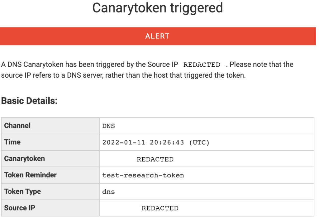 Finally, the domain being contacted results in the canary token being triggered and email being sent with some information that can be used to begin incident response procedures. Figure 15 below shows an example of the data that will be sent to the end user when configuring a DNS token with canarytokens.org.