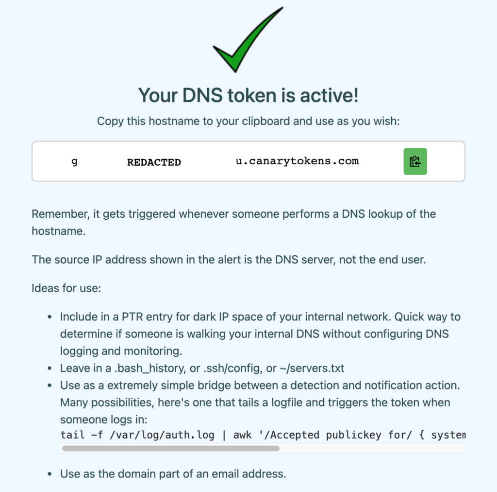 In the previous examples it was demonstrated how to sinkhole known malicious domains, but we’re not aware if/when these malicious domains are queried. While query logging exists within AWS Route 53 resolver, this is yet another data stream to ingest, write queries for and monitor. However, by leveraging the AWS custom DNS response in conjunction with Canarytoken’s DNS tokens, a single alerting mechanism for numerous DNS records stored in a rule list can be implemented. Figure 12 below shows the subdomain generated by Canarytokens that when queried will alert an e-mail address specified during token registration. Notably, the DNS tokens were readily used.