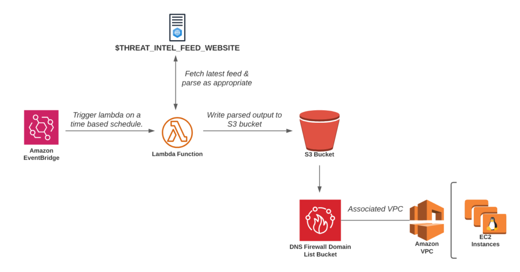 Expanding on our previous example of leveraging the AWS DNS Firewall, adding domains manually is far too tedious and does not scale with how quickly threat intelligence grows stale. As previously discussed it’s possible to point to a file in an S3 bucket that can be regularly updated. This portion of the blog will look at building cloud native infrastructure to regularly collect and update an S3 bucket of malicious domains for the DNS firewall.