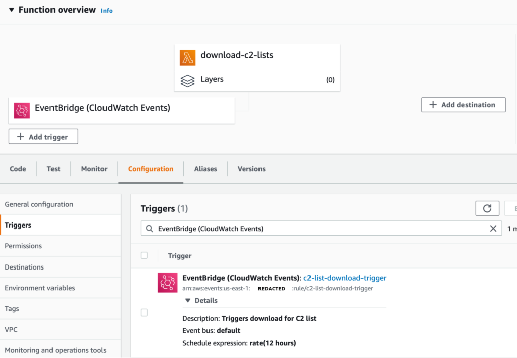 After setting up the event bridge with a target Lambda function, the lambda function itself should look like something in the image below. There is no destination to the right as the lambda function itself simply writes data to an S3 bucket. It’s possible to expand on this example architecture and write data to a SNS queue for further processing if you so chose. Additionally, you could have a webhook be queried to notify a slack channel that the threat intel feed was recently updated.