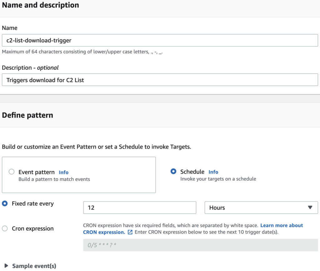 Now that a Lambda function has been created, there needs to be a way to trigger it. While there are numerous ways to trigger a Lambda function, this example will use an Eventbridge cronjob which will execute on a fixed time schedule.