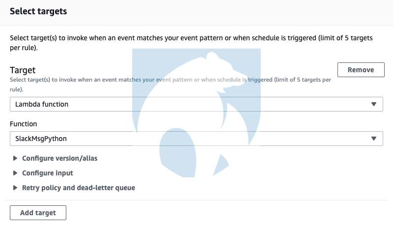 An enduser can configure specific ECR image tags, repositories, actions, etc…for their Eventbridge rule. The next section of the Everbridge form specifies the “target” portion of the Eventbridge architecture. The target is what is invoked if an Eventbridge rule is matched. Up to five different targets can be configured to be triggered if a specific rule is matched. Several different targets exist at the time of this writing, but we will focus on Lambda functions.