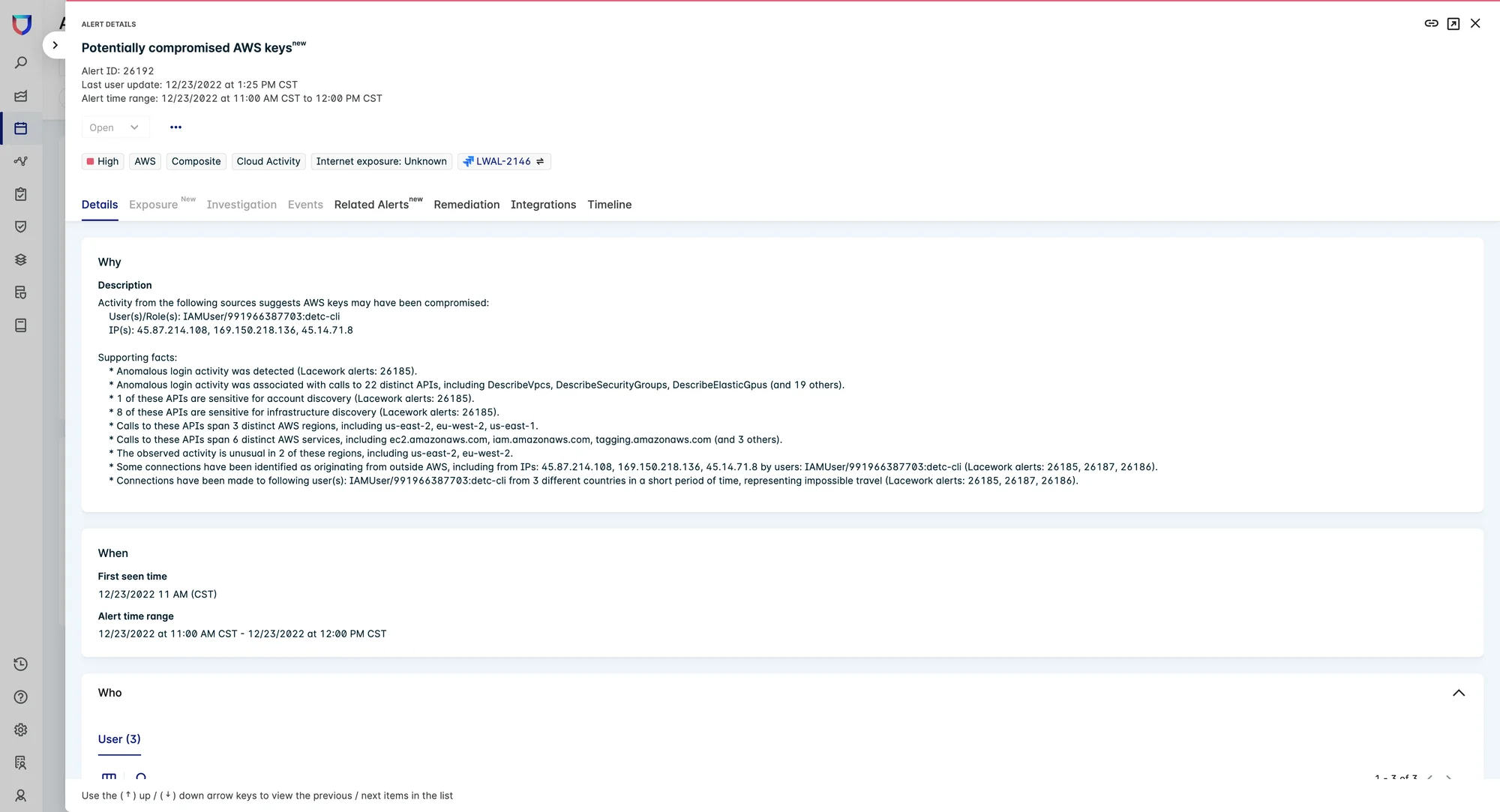Normally, the victim organization would receive multiple alerts for this scenario — for anomalous login, suspicious use of a new service, new region, or new connections. With Lacework, users receive a single, high-confidence composite alert with all the context needed to effectively triage and investigate.