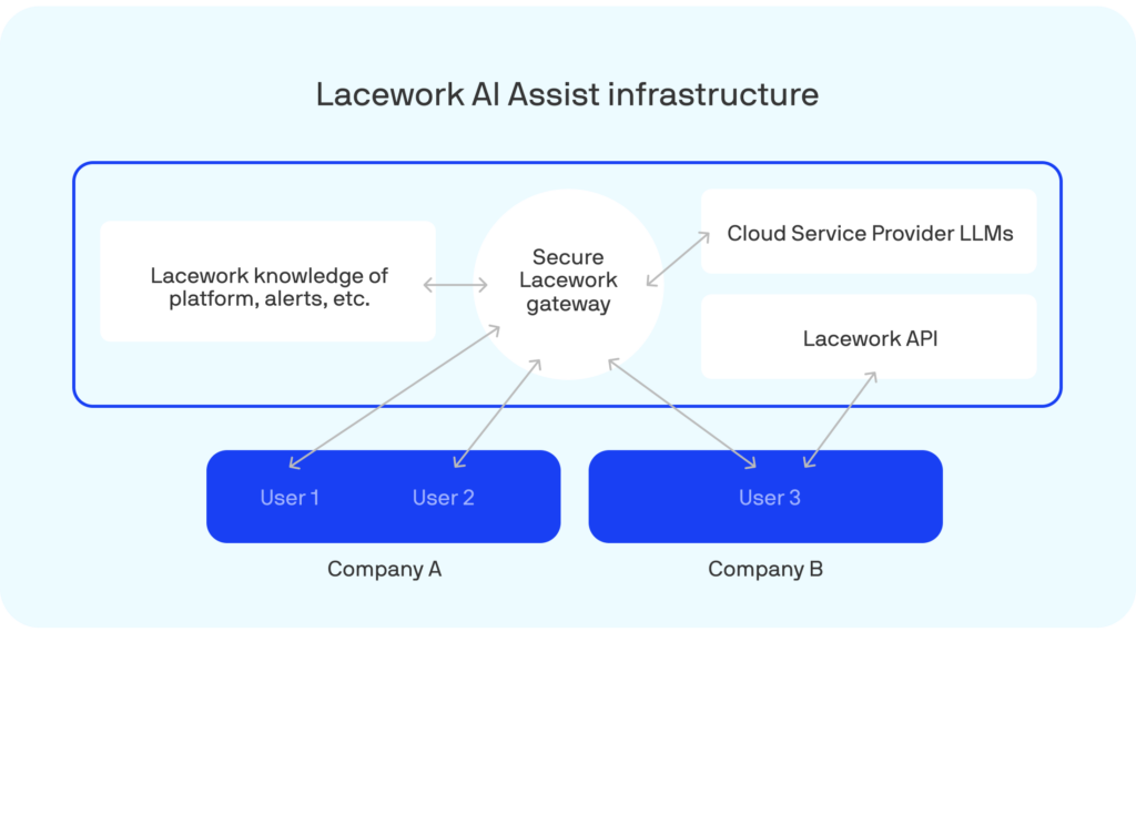 Lacework AI Assist takes advantage of the cloud service providers’ large language models (LLMs) and pulls them into our cloud infrastructure. When you ask Lacework AI Assist a question, it uses the LLM to query the Lacework platform and then uses this information to construct an answer. Your data never leaves the secure and private Lacework cloud infrastructure. All information and API calls are maintained with our cloud infrastructure.