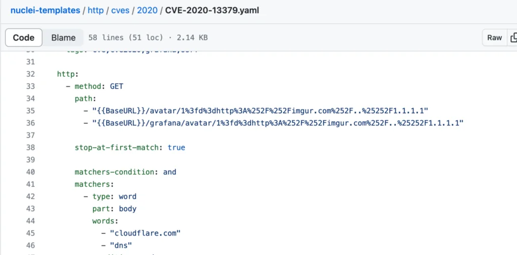 A similar indication may be a connection from Grafana to Cloudflare DNS 1.1.1.1. This is the redirect used by ProjectDiscovery’s Nuclei scanner. The Nuclei scanner is a popular open source scanner leveraged for both testing purposes and malicious reconnaissance. Nuclei scanner offers templates that can easily be used for mass scanning. For Nuclei’s CVE 2020-13379 template, a successful SSRF exploit initiates a redirect to 1.1.1.1 and the returned webpage is inspected for the keywords “Cloudflare” and “DNS” to confirm successful exploitation.