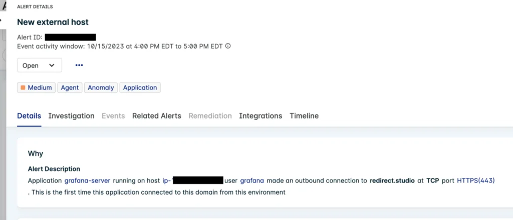 Figure 1: Lacework anomaly event from Grafana SSRF redirect