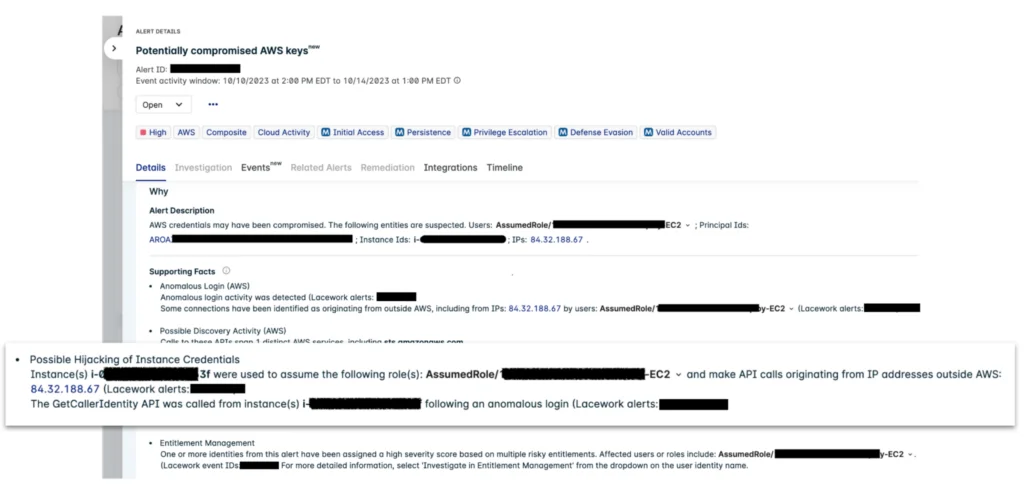 In the Lacework composite alert shown above, we have the Possible Hijacking of Instance Credential signal which alerted the customer to the suspected key compromise. Additional signals, such as anomalous login and discovery activity, strengthen the alert to warrant a high severity. It’s important to note that any potential instance of credential hijacking accompanied by activity that is anomalous for the role should be considered highly suspicious. This is especially true for any infrastructure discovery or S3 reconnaissance, as this may be a leading indicator of a data breach.