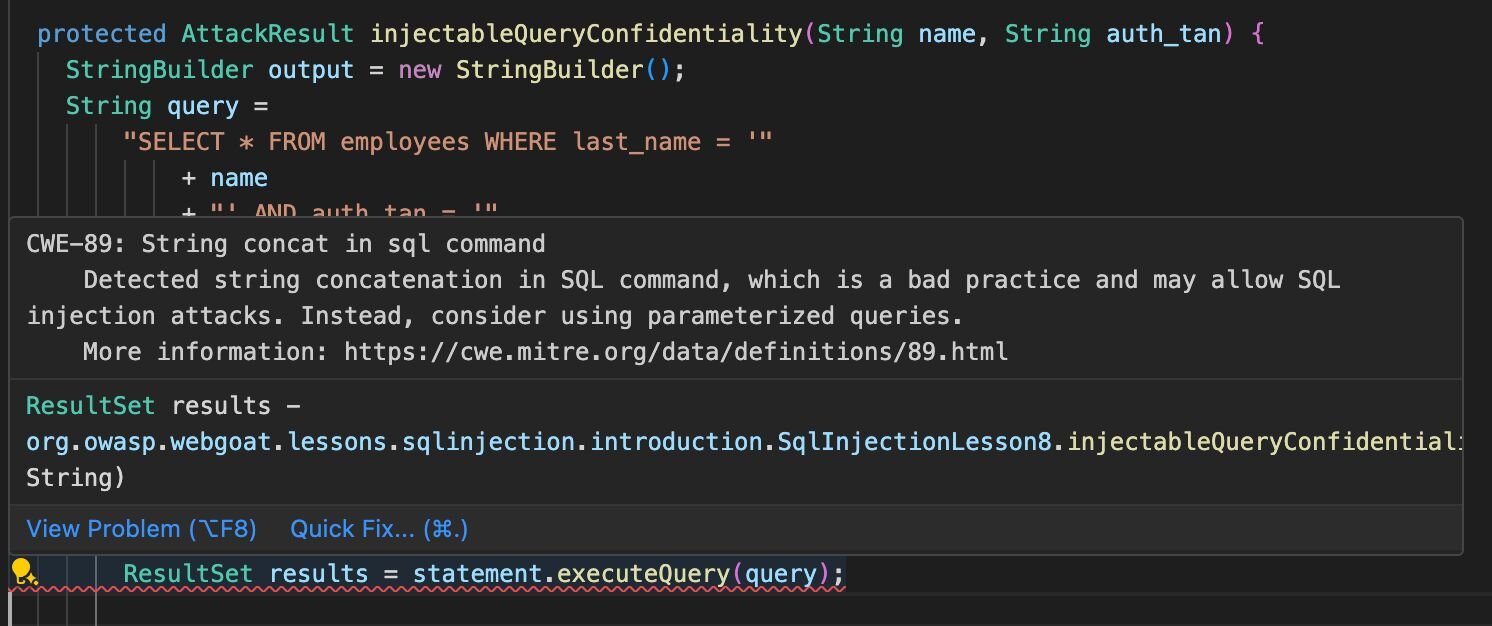 In order to achieve the above outcomes, FastSAST focuses on locally checkable code practices rather than flaws requiring additional security knowledge. Below we give an example where FastSAST detects a potentially dangerous use of concatenation in an SQL command (this use might or might not be exploitable, depending on the surrounding code).
