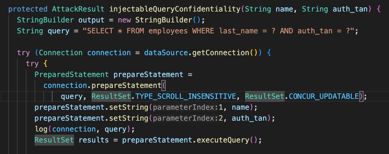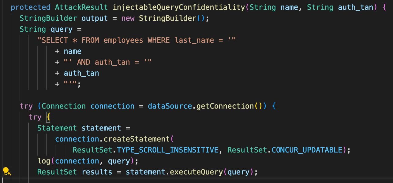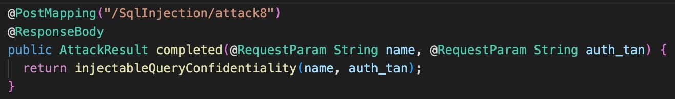 While not by itself a vulnerability, this code is dangerous in the sense that it can be used in such a way as to lead to an SQL injection. This can be the case if, for example, injectibleQueryConfidentiality(name,auth_tan) is called with user-controlled parameters.