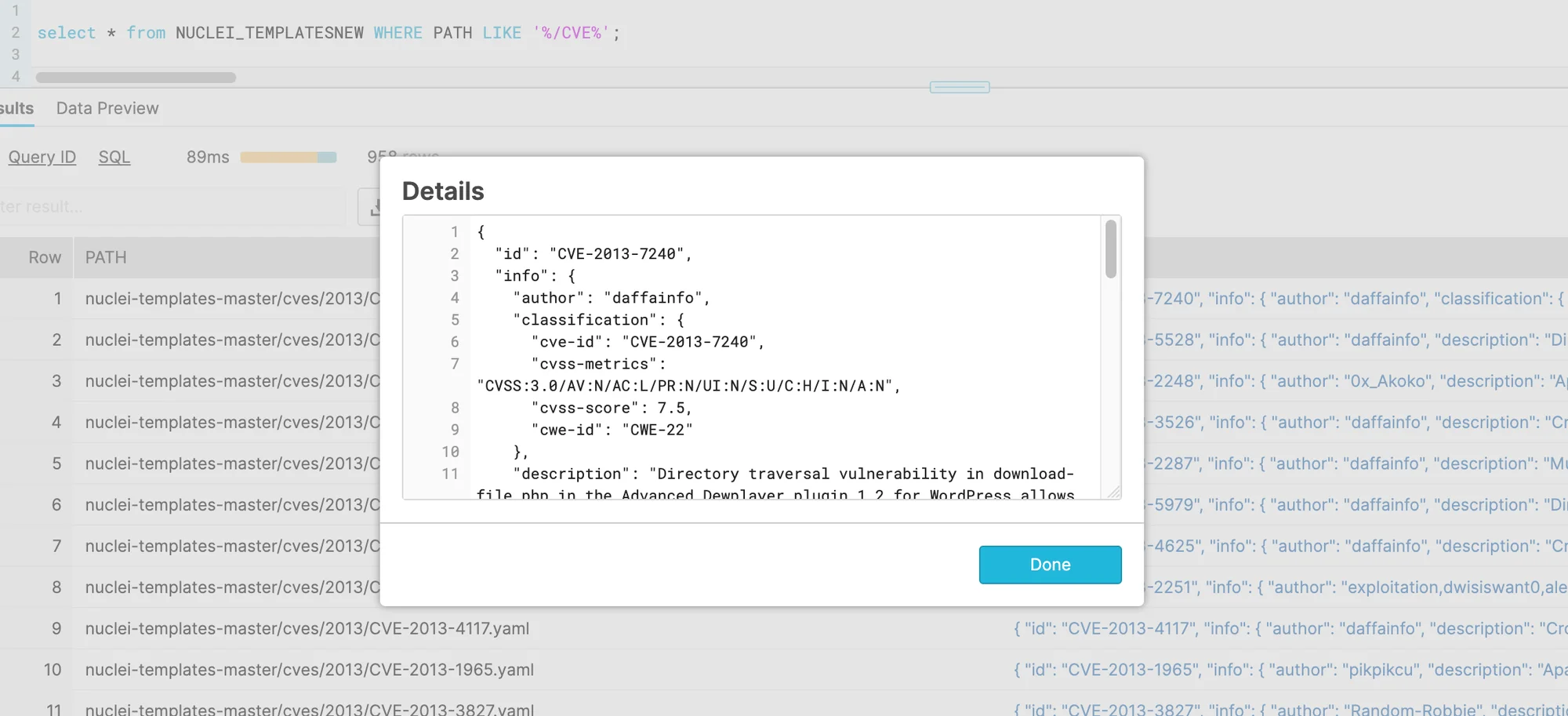 Another use case is for artifact extraction. For example, by querying the Nuclei YAML keys we can map a given exploit name and description to the associated artifact that would appear in traffic. This can be used for rule development and to obtain context on any attack, not just those originating from Project Discovery. For example: