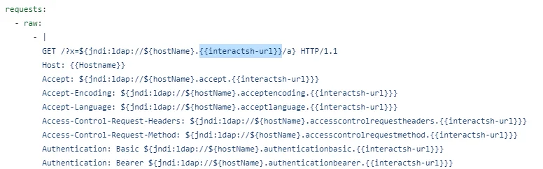 WHERE PATH LIKE '%/CVE%' group by cve_year order by cvecount desc;Not all of the Nuclei templates use OAST methods. OAST configs can be identified with the interact URL format string: {{interactsh-url}}. Example YAML for Log4j.