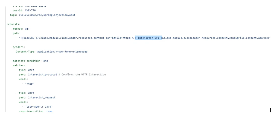 Nuclei_templates where YAML like '%{interactsh-url}%';</codeSpring4shell Update