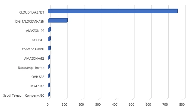 Analysis of Project Discovery activity revealed Cloudflare and DigitalOcean as the top originators. DigitalOcean was likewise one of the top traffic sources for Log4j exploits during the initial wave. The following is a breakdown of Project Discovery traffic origins over a month-long period. Note: In order for a scan to be linked to Project Discovery, the IP had to have been observed with two or more of the previously mentioned hard-coded user-agents as well as have used one of the known Project Discovery exploits and/or OAST domains.