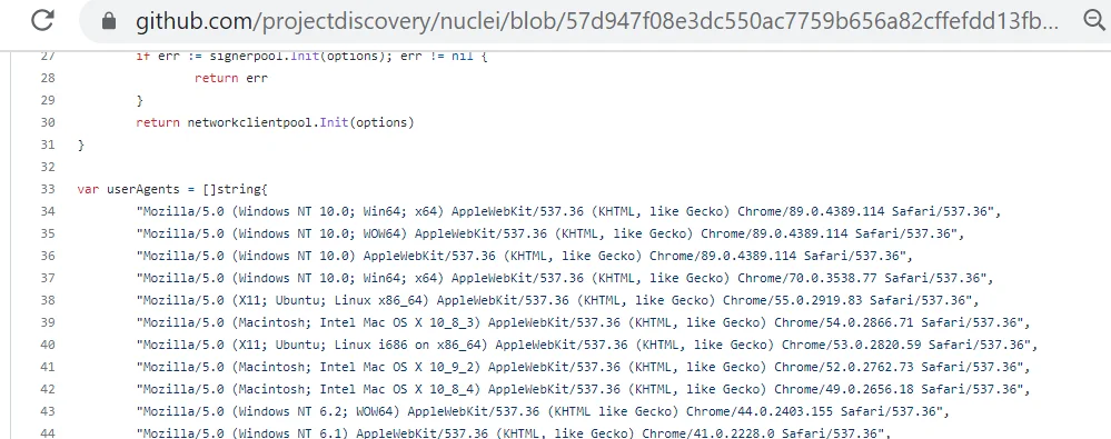 Detection of Log4j exploits from Project Discovery is relatively simple and only requires the presence of the previously mentioned OAST domains and a Log4j artifact. That said, Log4j accounted for only a small fraction of overall Project Discovery OAST traffic. Additionally, much of the Project Discovery traffic is not OAST related and doesn’t leverage the OAST domains at all. For detection of these non-OAST artifacts, one can look for the presence of one of several user agents used by Project Discovery’s Nuclei scanner. Examination of the Nuclei source code on Github revealed 32 user agents that are cycled through during testing. While these are easy to switch out, a large amount of traffic leverages them by default.