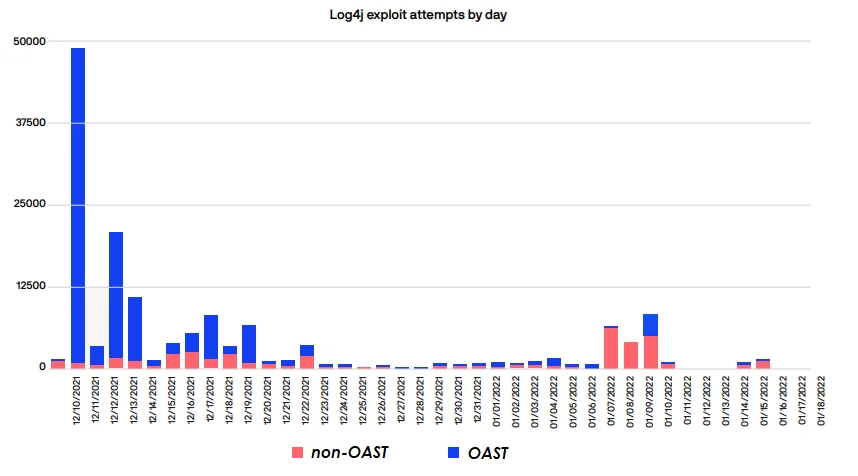 Figure 2. Non-OAST and OAST Log4j exploit attempts by day