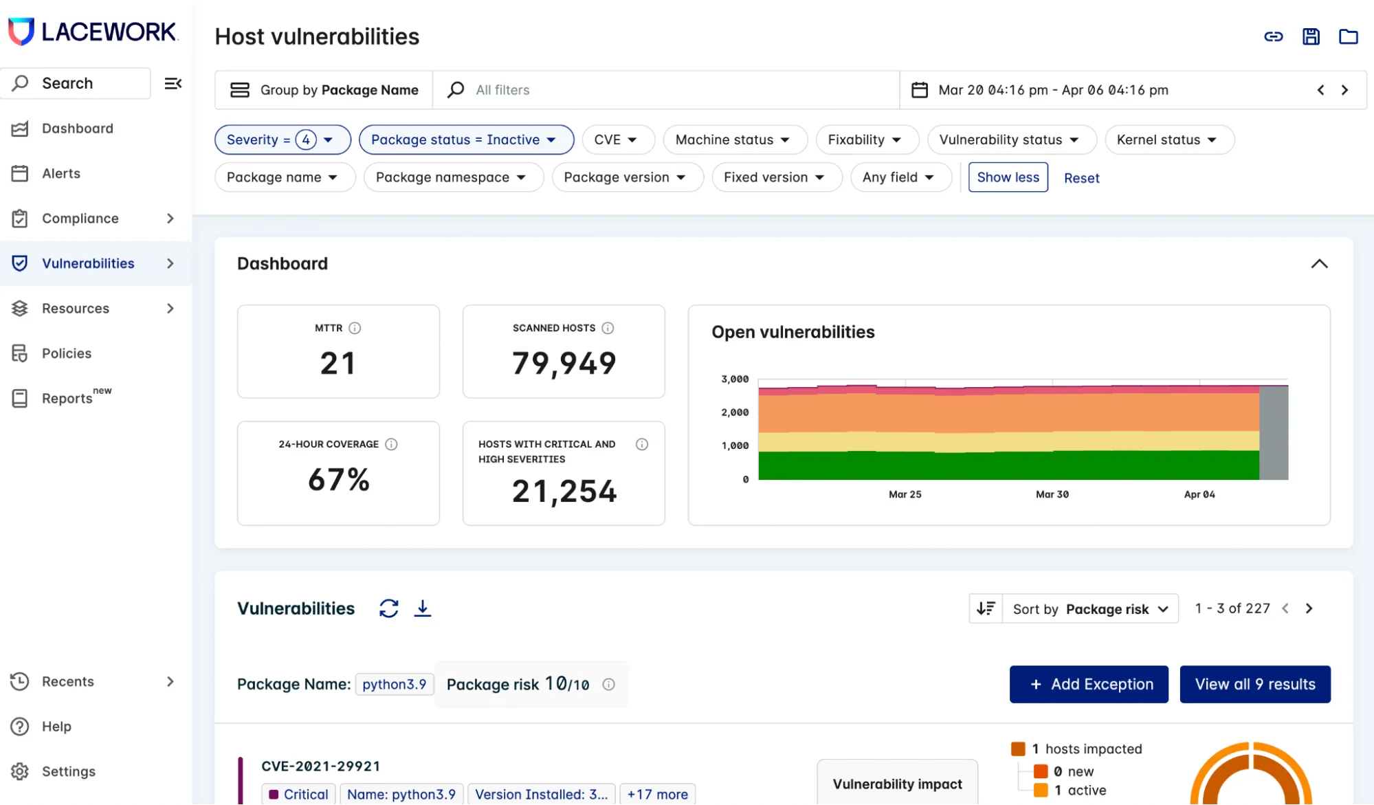 Inactive vulnerable packages vs total vulnerable packages = 79%This cloud workload contains 1,361 unique packages running on 2,428 machines (including short-lived VMs). It includes 14 active packages with a critical vulnerability. But it also includes 25 packages with a critical vulnerability that have never been executed anytime anywhere from March 20 to April 3 on the 2,428 machines monitored by Lacework agents. Guess which critical vulnerabilities should be fixed next by this customer? You got it.