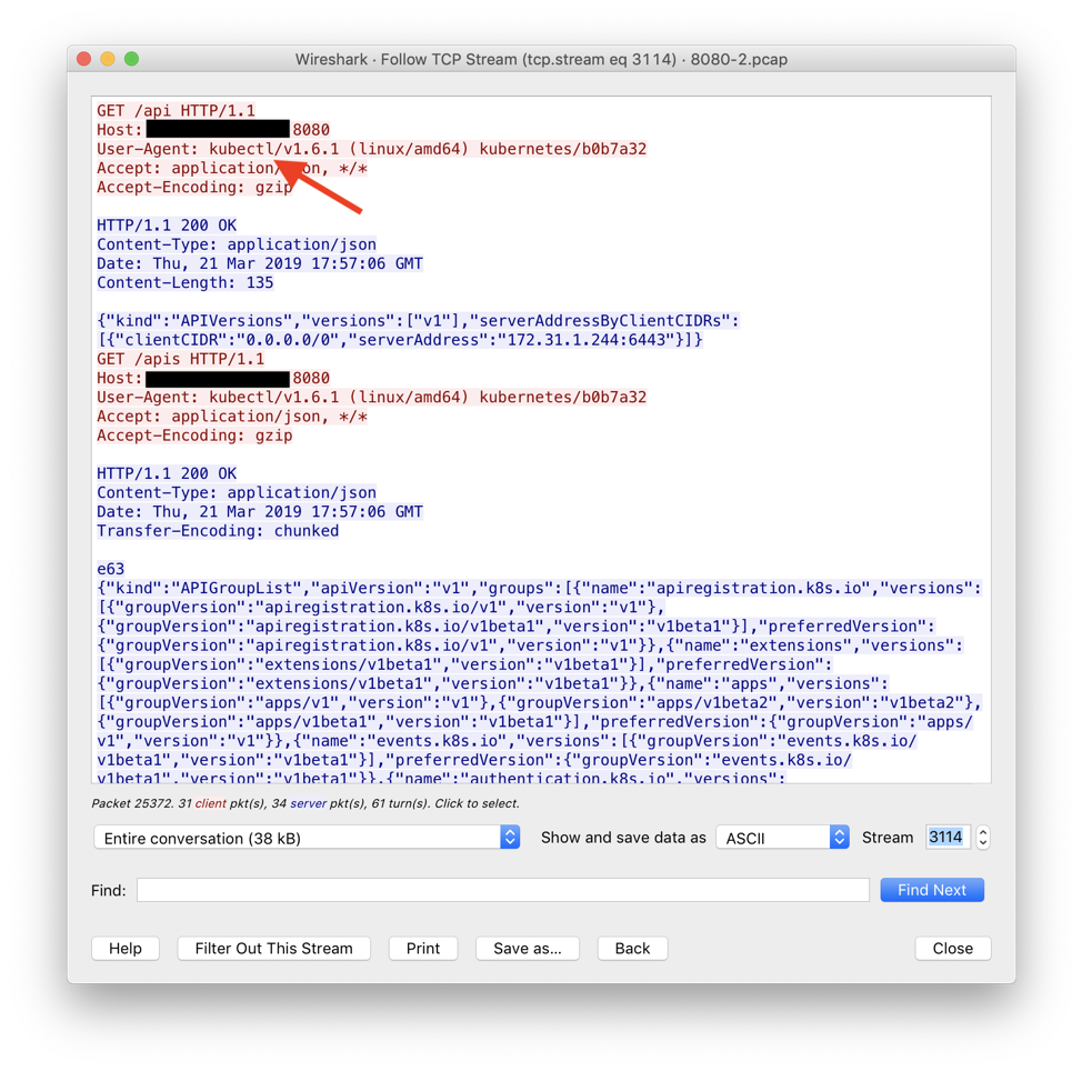 Figure 2. Wireshark screenshot of requests from kubectl to the insecure API.
