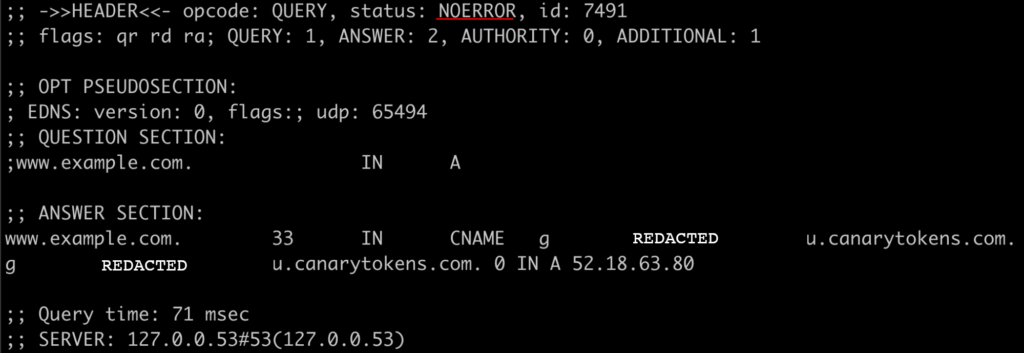 Revisiting the target host, the domain will resolve triggering the canary token subdomain, but the IP resolved will be to canary token DNS servers and not upstream malicious servers. It’s important to understand that the custom record value provided will respond with a “NOERROR” DNS query response to the application making the request. Depending on the TTL specified during the custom DNS action configuration will also influence the cache time on the underlying host.