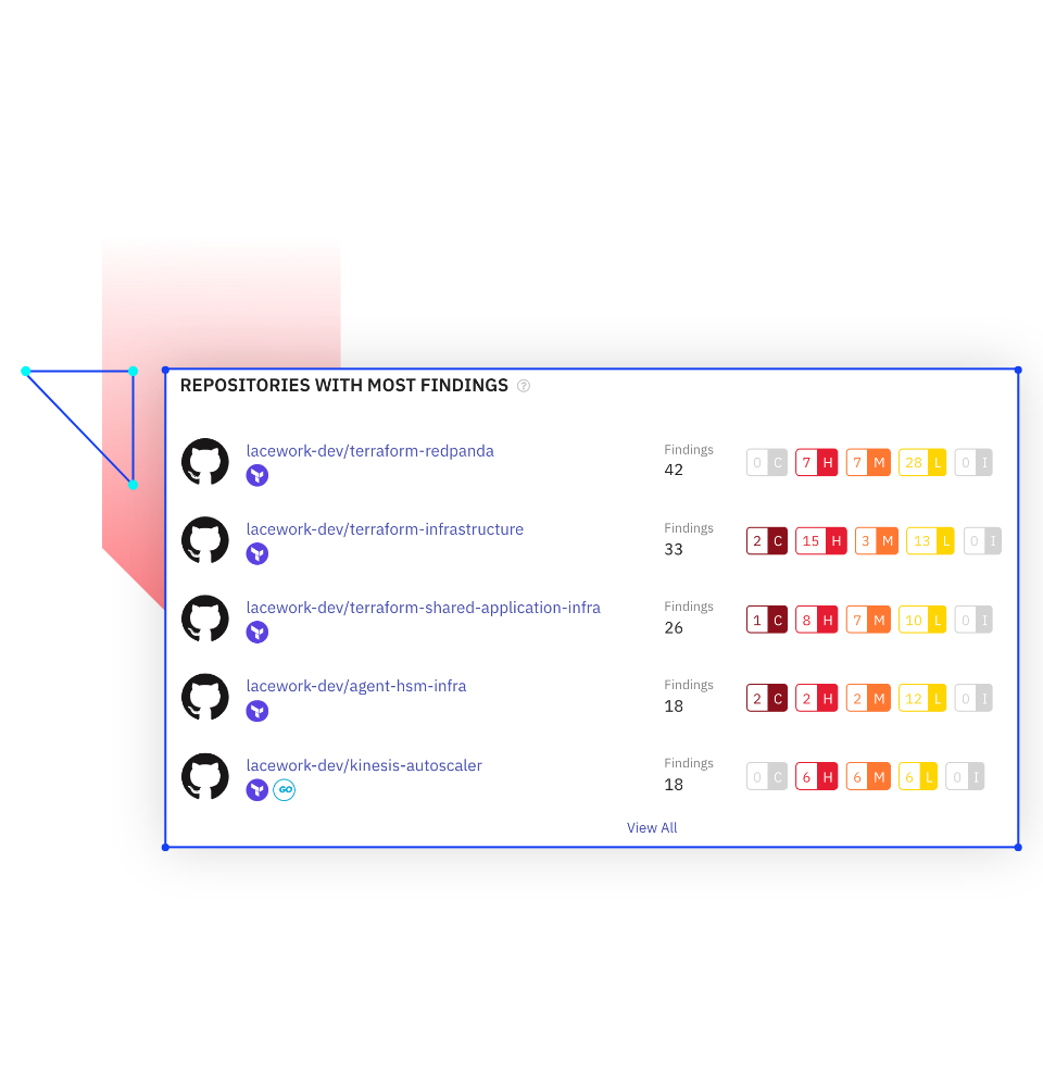 Lacework helps developers to identify and fix cloud configuration issues in development before they are deployed to live environments. Delivering secure IaC reduces the volume of risky changes, decreases the time and labor cost of security remediation, and helps compensate for an industry-wide skills gap in cloud configuration management.