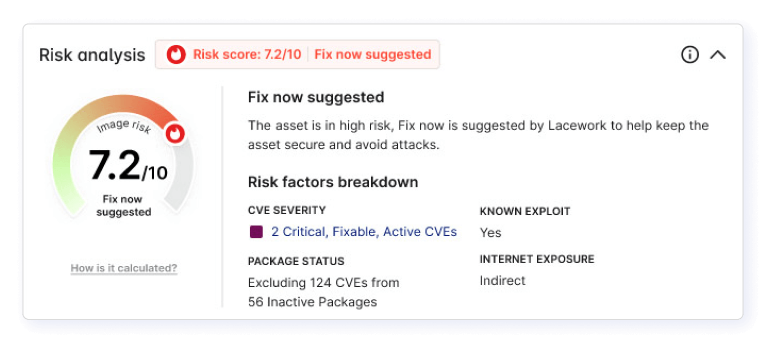 With so many vulnerabilities to patch, it’s critical to consider the exploitability of a vulnerability. The key factor for exploitability is to determine whether an asset is exposed to the internet. Your solution should be able to gauge if a workload configuration is exposed to the internet and then factor in internet exposure as part of the risk score. Ideally, this value is available as a filter for prioritization as well. In addition, when thinking about prioritization for containers, you should target the images that are actually deployed in production. By correlating vulnerability risk data with runtime observations, you can better prioritize which vulnerabilities to fix first.