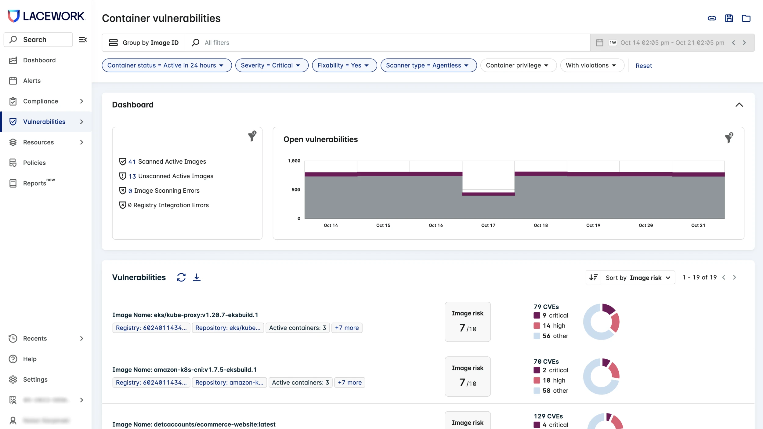 - Integrate the Lacework platform scanner with public registries to continuously scan container images for vulnerable packages and language libraries